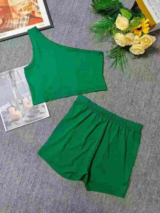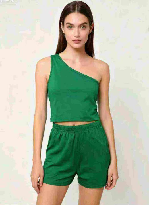 工厂回收84套外贸热卖绿色斜肩吊带短裤套装,码数S-XL。面料有弹性,全部独立包装。