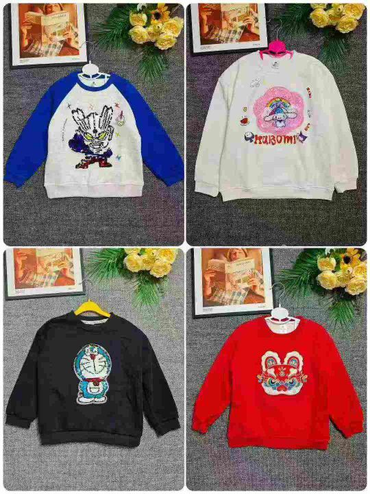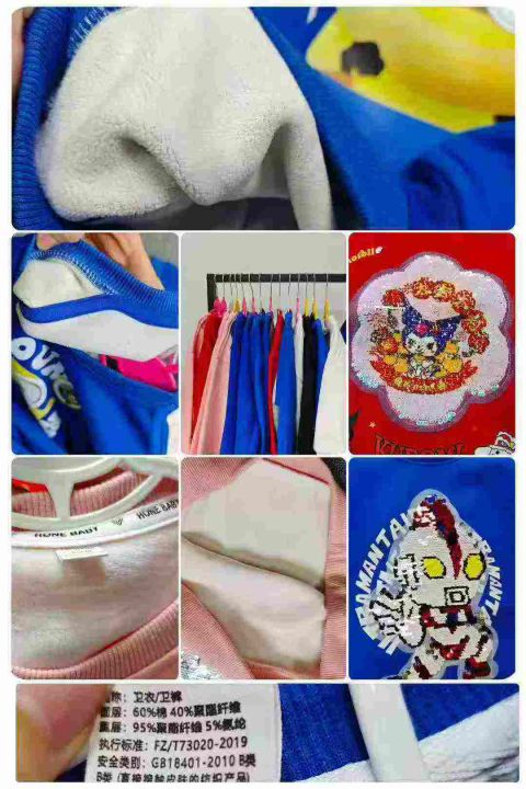 天猫仓回收465件华棉潮牌加婴儿绒秋冬童装卫衣,码数100-150。质量超好,手感软糯舒适,有后领包边到肩,很多都是亮片可以拨动变色的工艺款。带纸板高级拉链袋包装。分货➕1