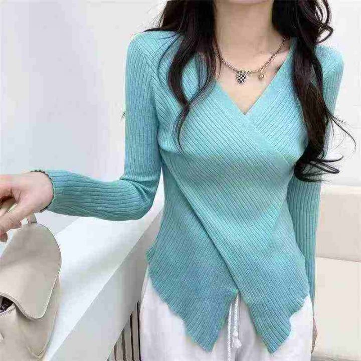 秋冬新款网红设计感宽松百搭小众交叉V领坑条包芯纱套头毛衣,独立包装,均...
