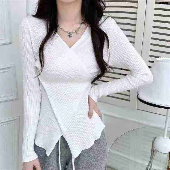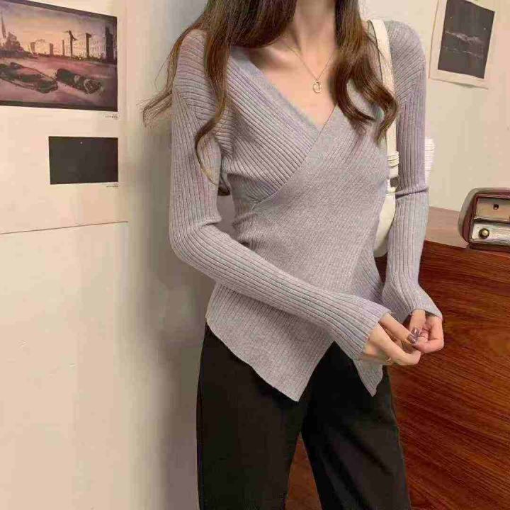 秋冬新款网红设计感宽松百搭小众交叉V领坑条包芯纱套...