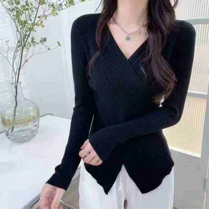 秋冬新款网红设计感宽松百搭小众交叉V领坑条包芯纱套...