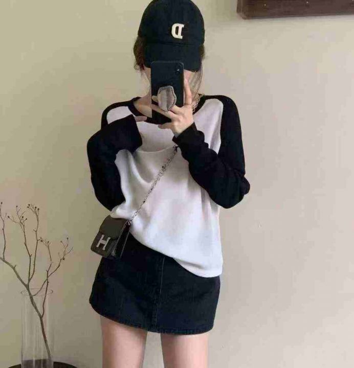 早秋新款复古美式小众破洞设计款宽松撞色百搭针织套头毛衣,独立包装,均码...
