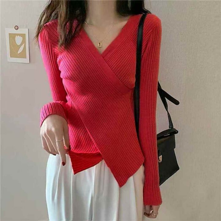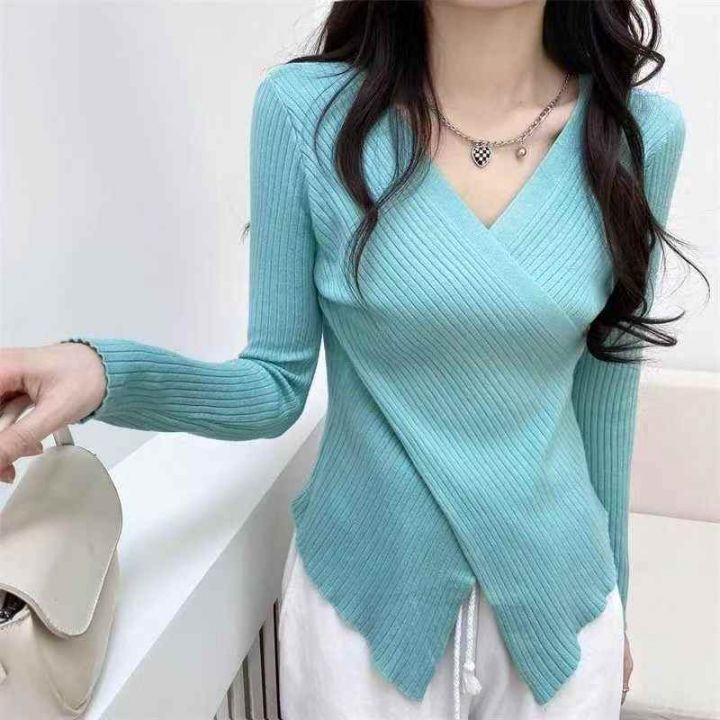 秋冬新款网红设计感宽松百搭小众交叉V领坑条包芯纱套...
