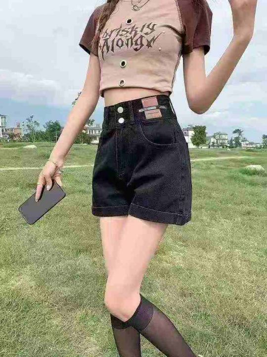 夏季爆款高品质女装洗水棉双排扣设计感高腰阔腿牛仔短...