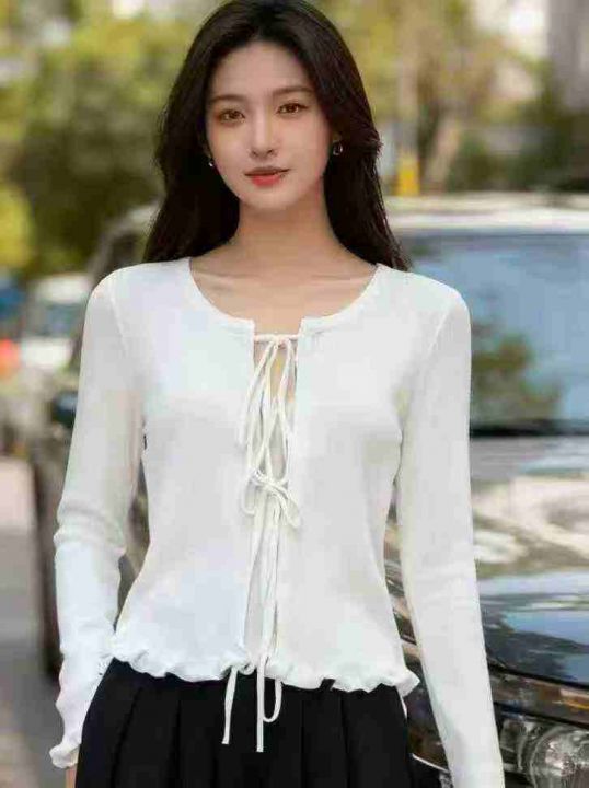 秋季新款韩系百搭宽松绑带花边针织毛衣开衫,独立包装...