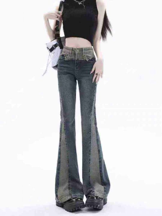 秋冬新款高品质复古网红设计款阔腿微喇叭牛仔长裤,独...
