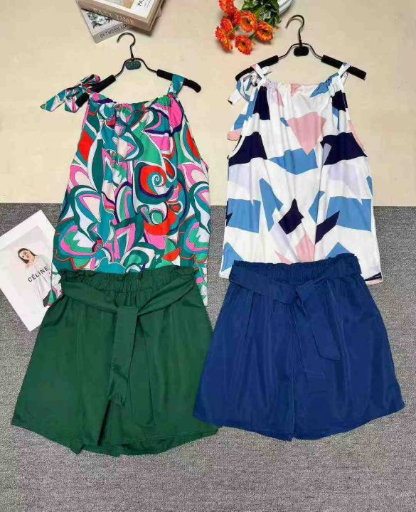 欧美外贸爆款几何印花系带无袖上衣束带短裤休闲套装 ...