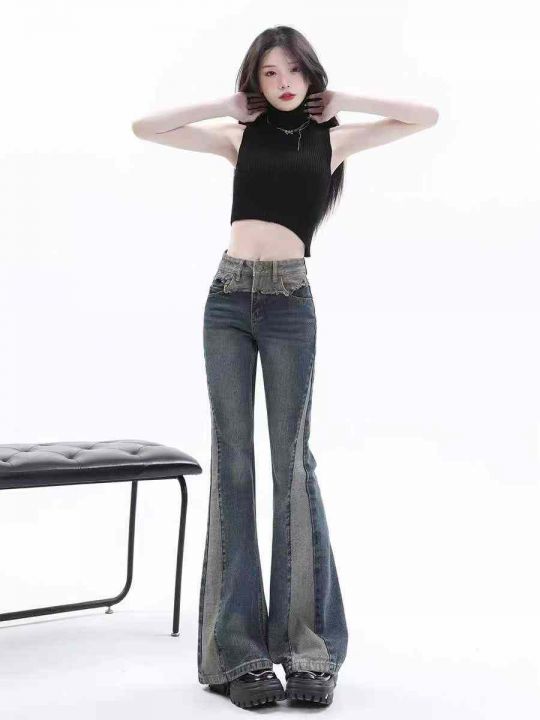 秋冬新款高品质复古网红设计款阔腿微喇叭牛仔长裤,独...
