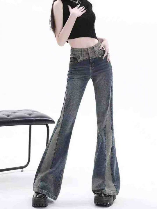 秋冬新款高品质复古网红设计款阔腿微喇叭牛仔长裤,独...