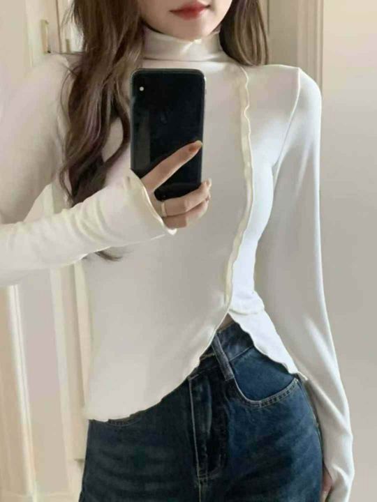 秋冬装螺纹德绒半高领T恤女设计感木耳边修身不规则百搭打底衫上衣潮,整款2色,面料软糯,弹力超大,独立包装,货品干净,1到4码,1150件左右,7.8清,分货加1。 货号:1303