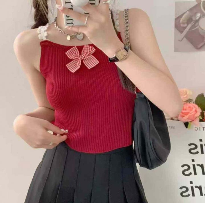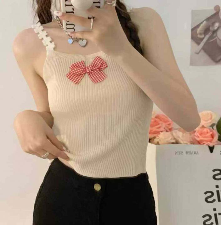 夏季新款港味风格蝴蝶结设计感纯欲辣妹针织吊带独立包...