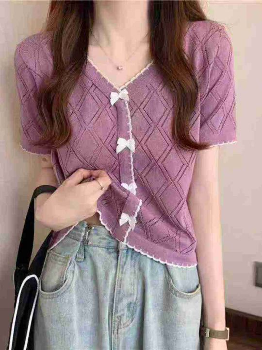 夏季新款镂空冰丝蝴蝶结设计感小众别致针织小衫,独立...