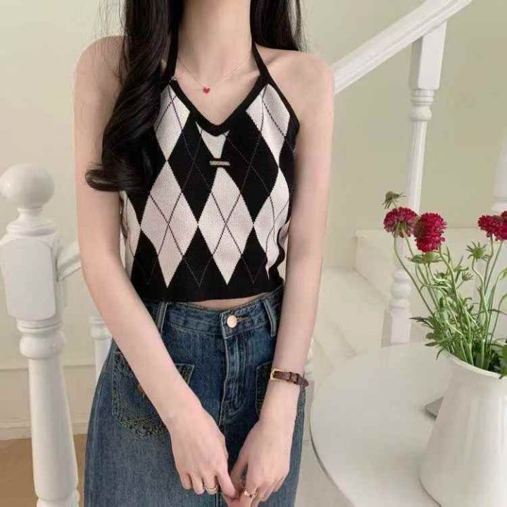 春夏新款复古菱格辣妹小标挂脖针织吊带背心独立包装,均码面料柔软舒适,64...