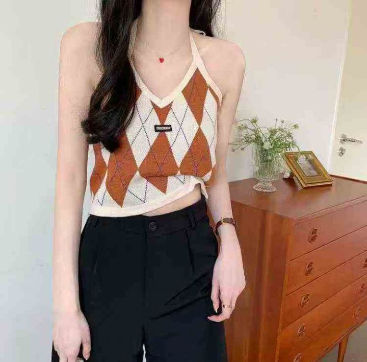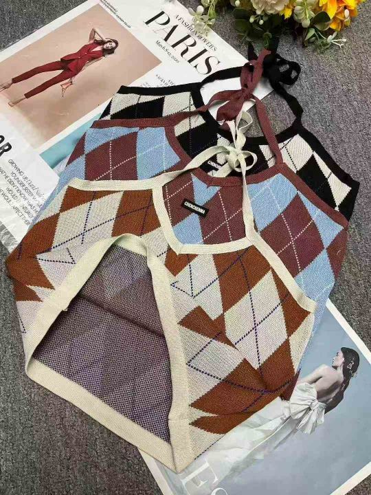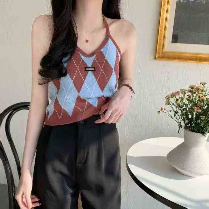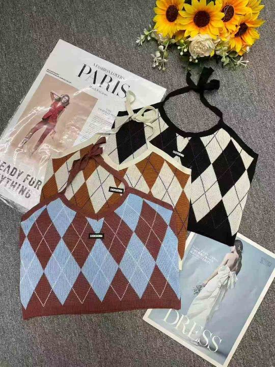 春夏新款复古菱格辣妹小标挂脖针织吊带背心独立包装,...
