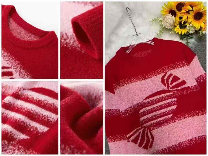 秋冬新款宽松慵懒风乐町草莓奶糖新年红氛围感包芯纱提花钻进套头毛衣,独立包装,均码面料软糯厚实,300件,全清9.9元超低价秒杀!分货加一!。 货号:1303
