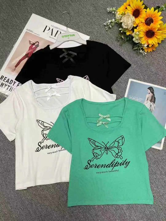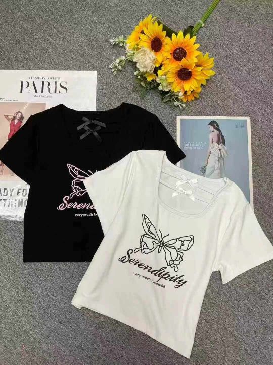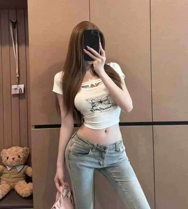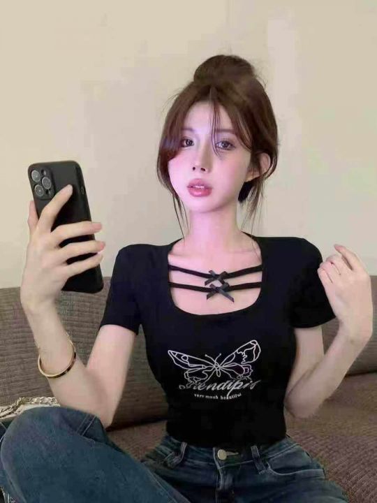 夏季新款甜辣妹绝美设计感小众蝴蝶印花u领弹力修身显瘦棉T桖,独立包装,均码面料柔软舒适弹力大,290件,全清5.9元超低价秒杀!分货加一!