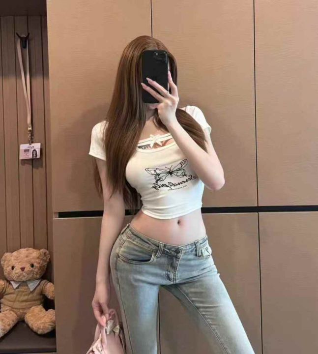 夏季新款甜辣妹绝美设计感小众蝴蝶印花u领弹力修身显瘦棉T桖,独立包装,均...