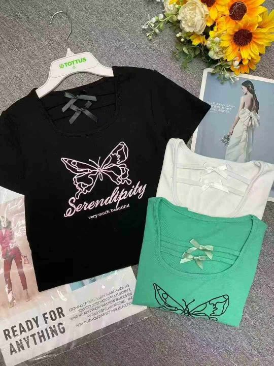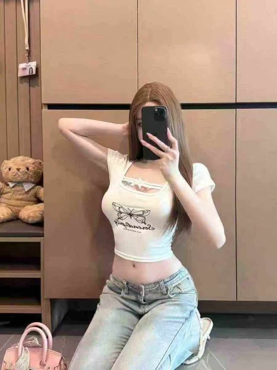 夏季新款甜辣妹绝美设计感小众蝴蝶印花u领弹力修身显瘦棉T桖,独立包装,均码面料柔软舒适弹力大,290件,全清5.9元超低价秒杀!分货加一!