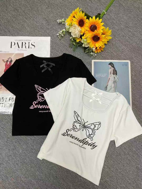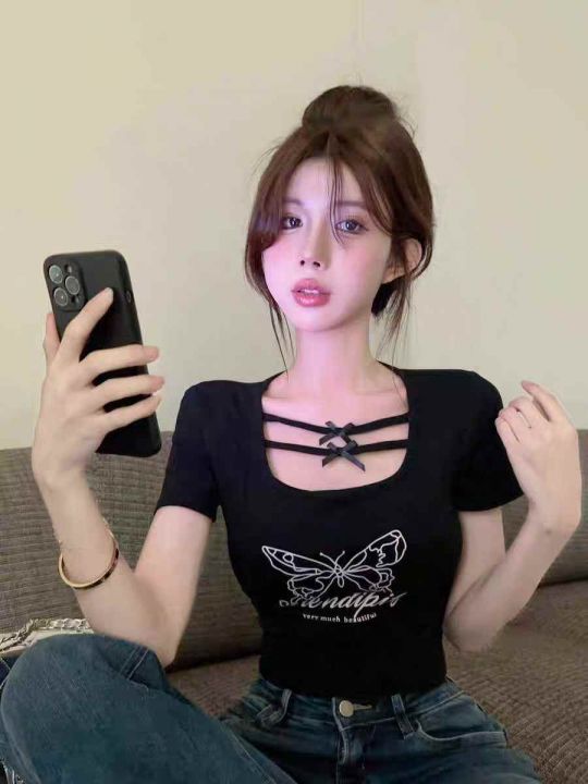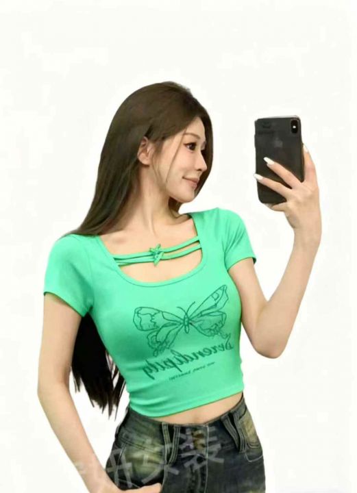 夏季新款甜辣妹绝美设计感小众蝴蝶印花u领弹力修身显瘦棉T桖,独立包装,均码面料柔软舒适弹力大,290件,全清5.9元超低价秒杀!分货加一!。 货号:1303