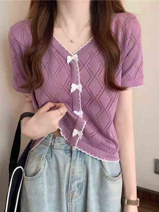 夏季新款镂空冰丝蝴蝶结设计感小众别致针织小衫,独立...