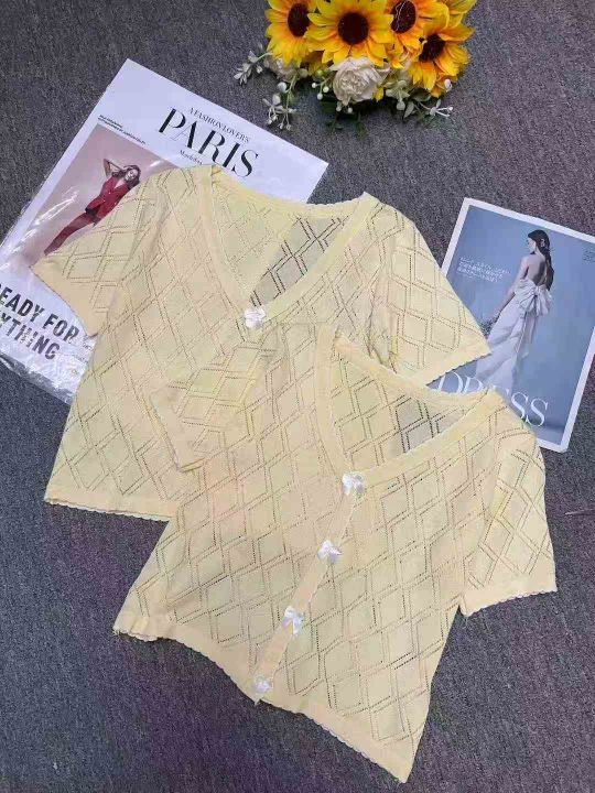 夏季新款镂空冰丝蝴蝶结设计感小众别致针织小衫,独立包装,均码面料柔软舒适,黄色为主,其他颜色有个别,100件,全清6.9元超低价秒杀!