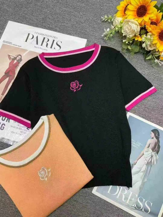 夏季新款撞色边玫瑰刺绣收腰显瘦针织短袖t桖,独立包装,均码面料柔软舒适弹力大,180件,全清6.9元超低价秒杀!