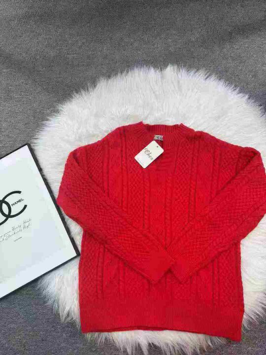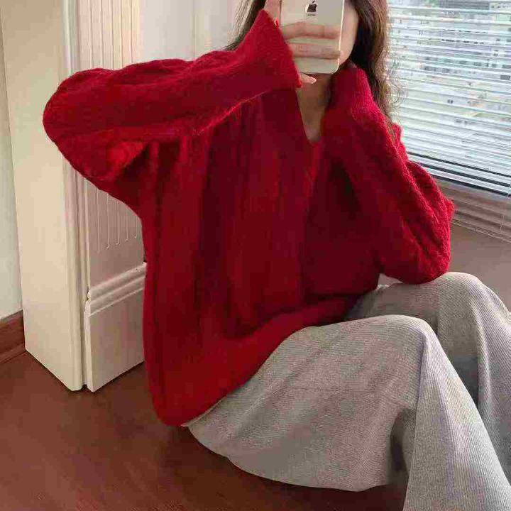 全清10.9,本命年女装V领麻花中长款套头毛衣女秋冬慵懒风宽松红色新年圣诞,单款单色,均码58件