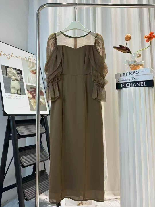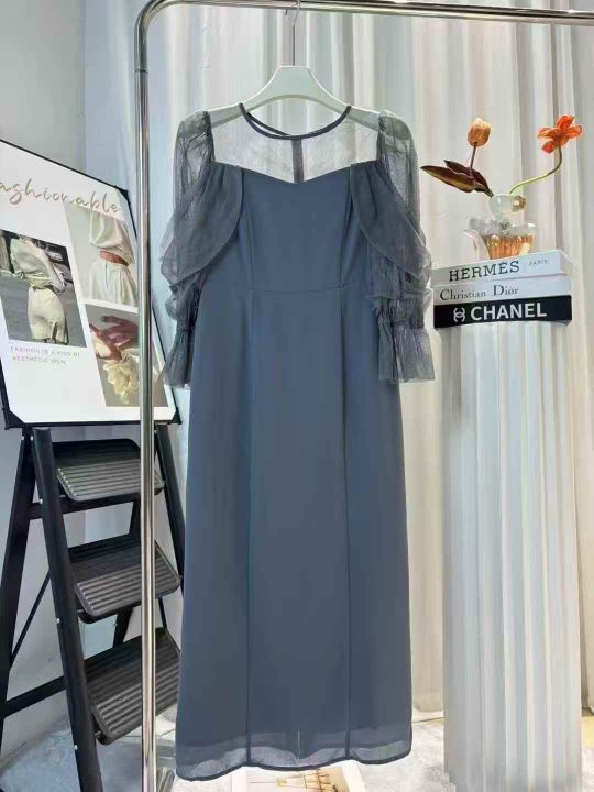 300条日单圆领拼接网纱微透喇叭袖收腰显瘦纯色开衩鱼尾连衣裙,质量超好!琉璃网纱微弹力不易勾丝,有内衬,尺码S-L,独立包装!全清17.8。 货号:1303