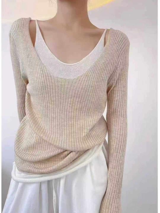 秋季新款假两件U领小众弹力修身显瘦长袖针织衫,独立包装,均码面料软糯舒...