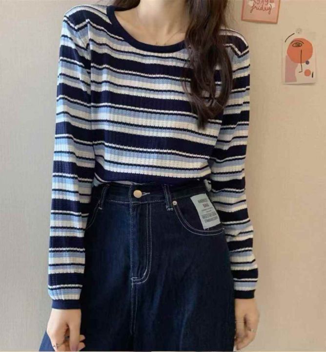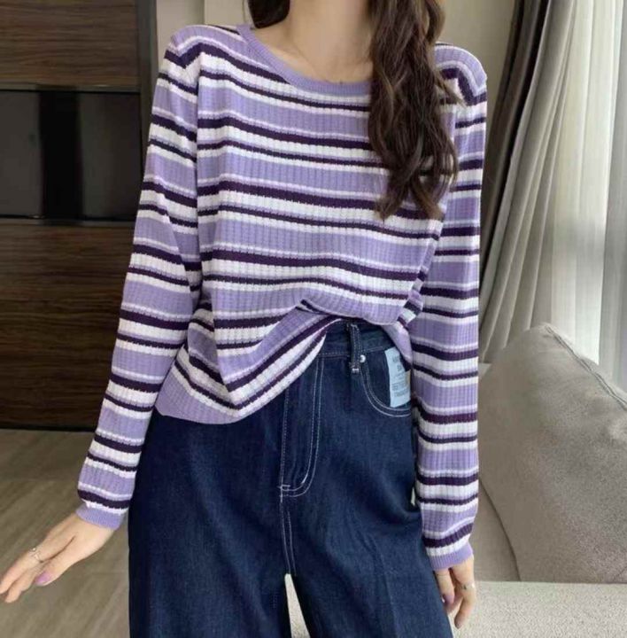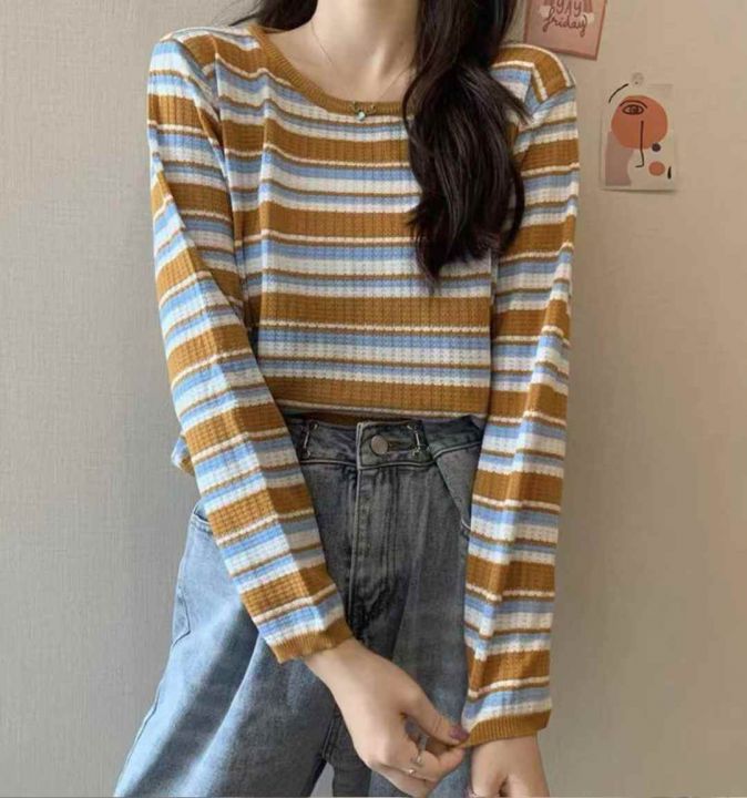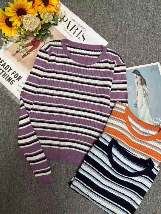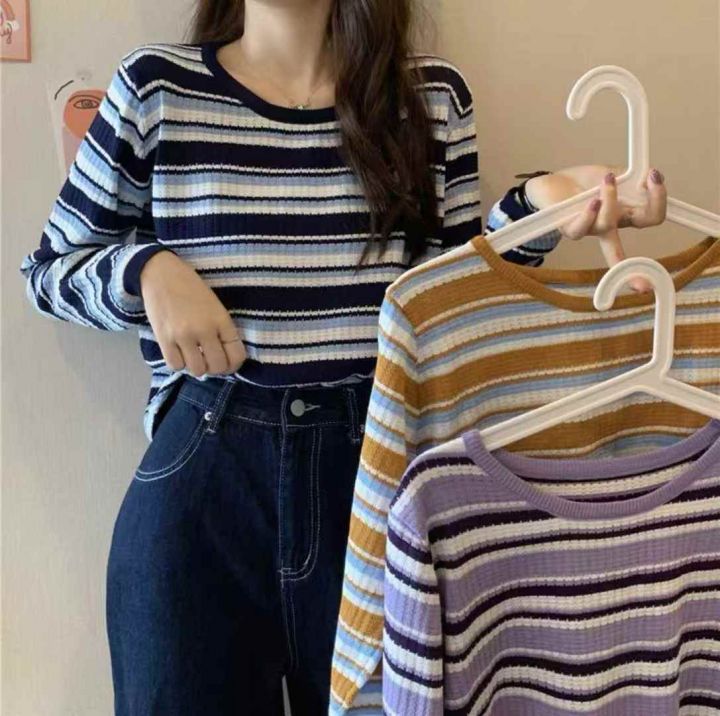 秋冬新款韩系撞色条纹减龄百搭针织套头毛衣,独立包装...