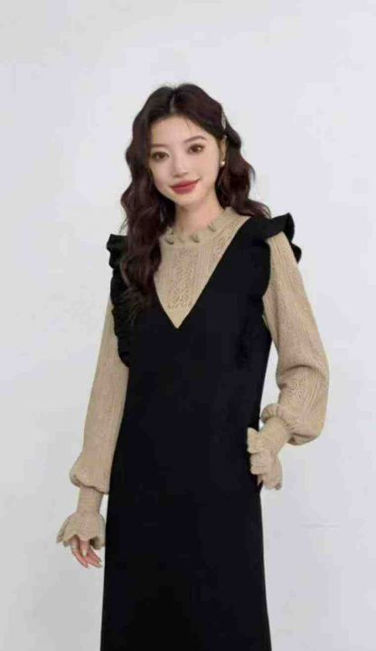秋冬新款韩系气质荷叶边假2件复古宽松慵懒风针织毛衣连衣裙,独立包装,均...