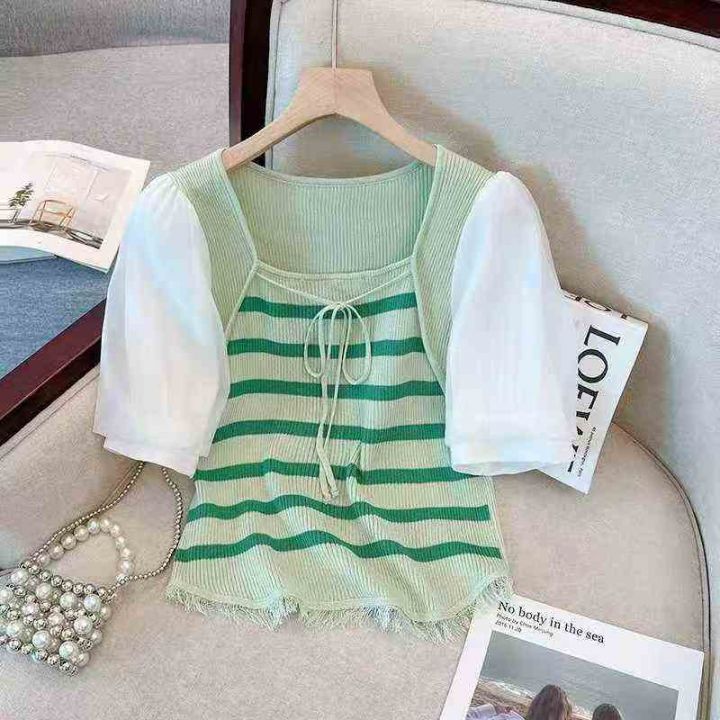 夏季新款假两撞色条雪纺袖拼接针织T桖,独立包装,均...