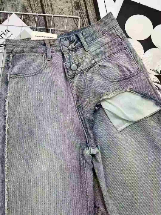 ☕️63033# 美式拼接毛边阔腿牛仔裤女秋季新款高腰宽...