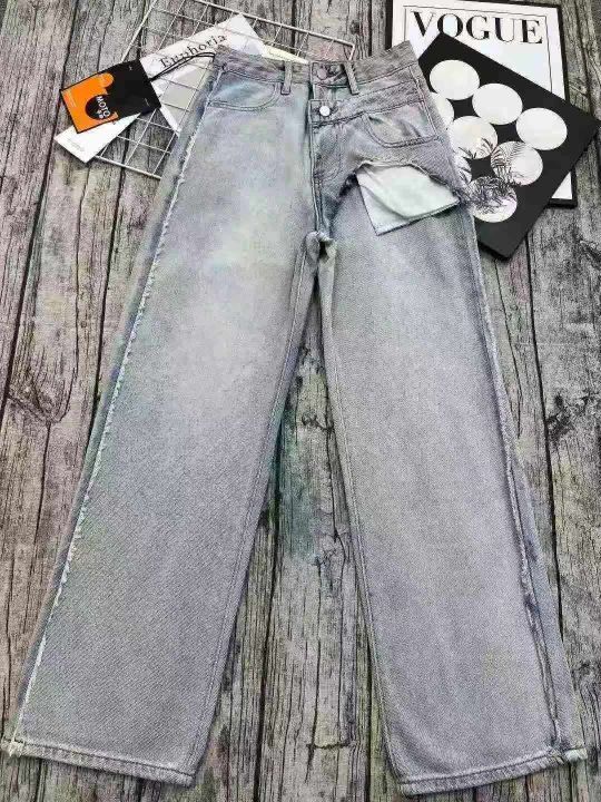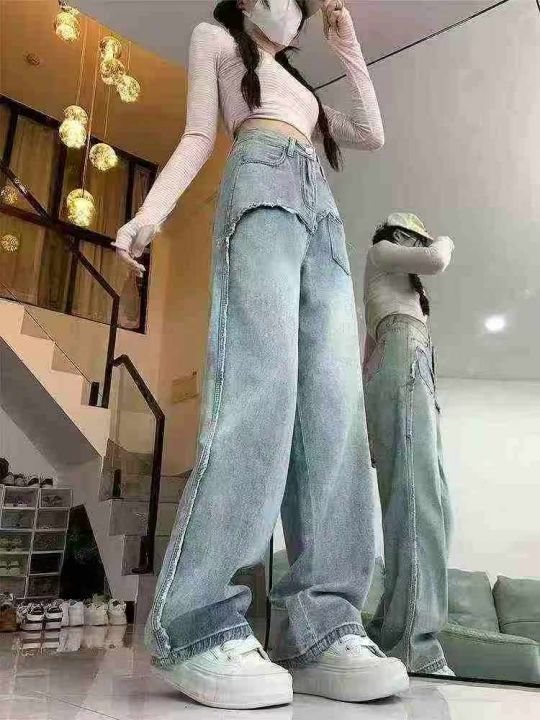 ☕️63033# 美式拼接毛边阔腿牛仔裤女秋季新款高腰宽松显瘦直筒长裤 350条全清14.8元 分货+1元