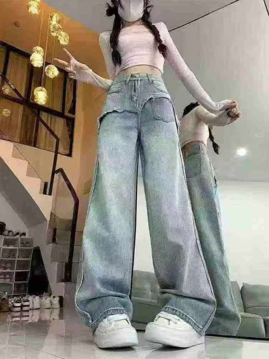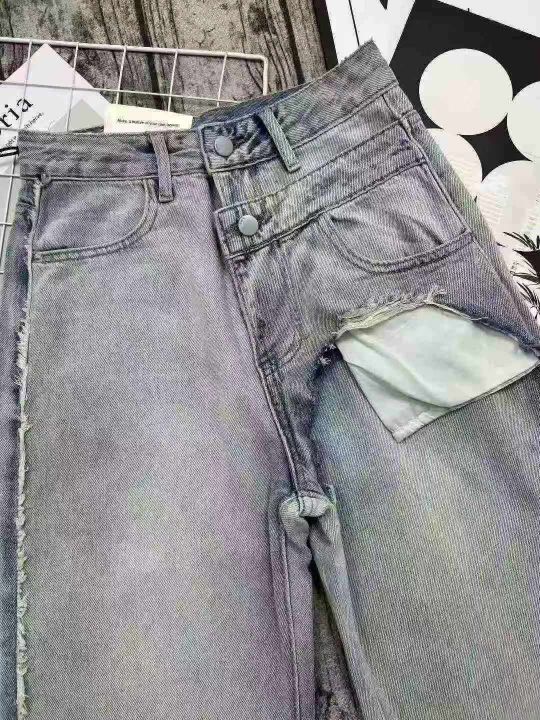 ☕️63033# 美式拼接毛边阔腿牛仔裤女秋季新款高腰宽...