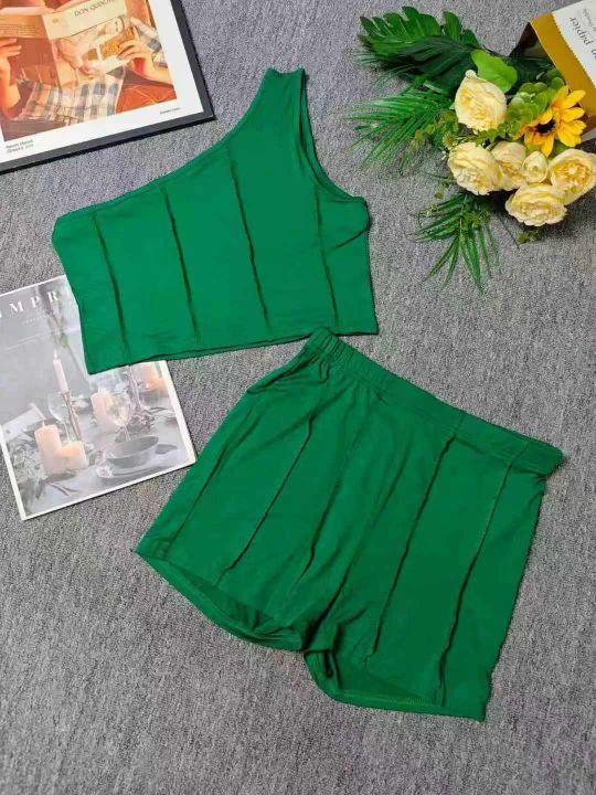 工厂回收84套外贸热卖绿色斜肩吊带短裤套装,码数S-XL。面料有弹性,全部独立包装。