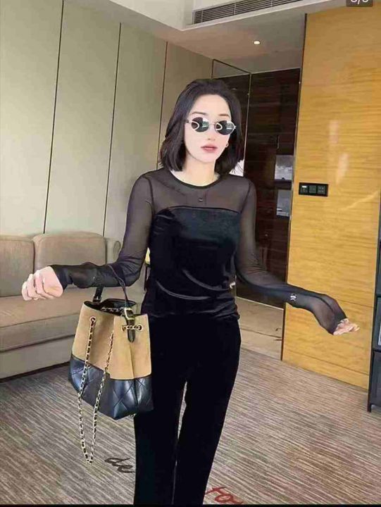 100多件2025秋网纱拼丝绒T恤打底衫女内搭性感小衫法式...
