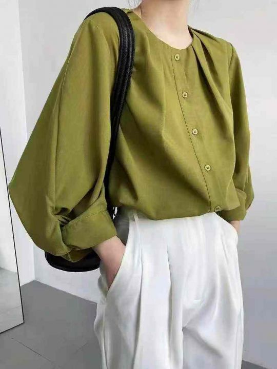 压褶简约衬衣111件7.9,灯笼袖别致茶系上衣,下摆弧形...