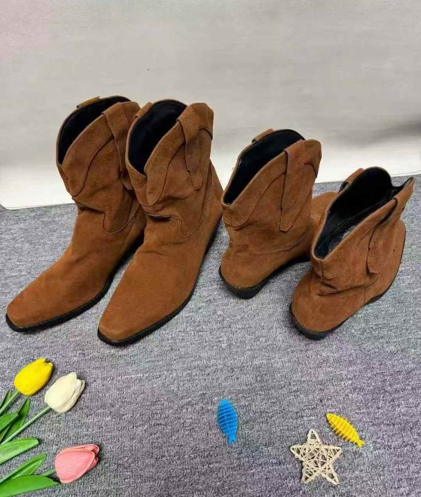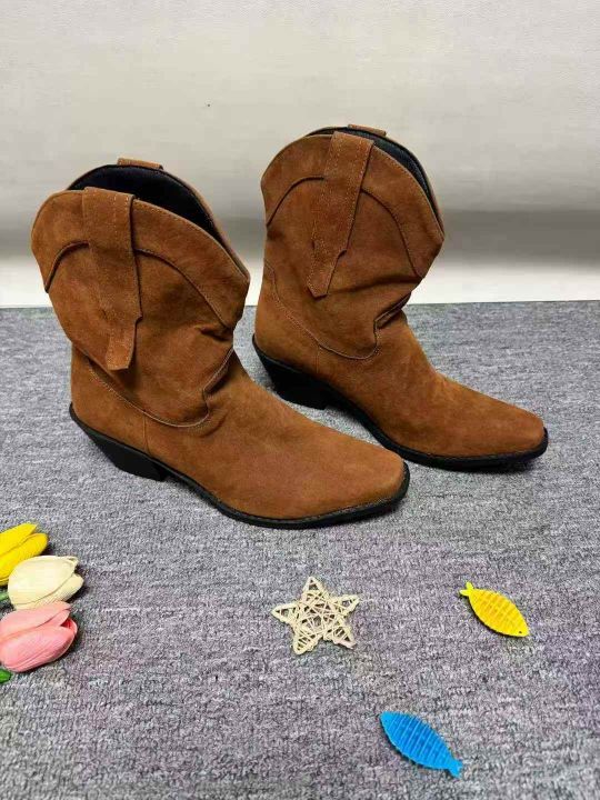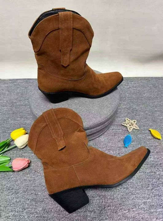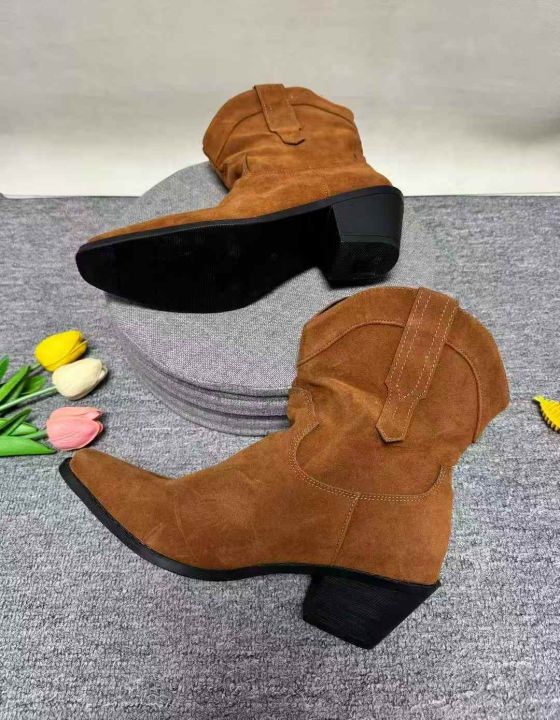 牛皮版~法式尖头西部牛仔靴女2025新款冬季短筒堆堆靴美拉德短靴,数量 80 双,码数 36-43。 图片款,鞋盒包装品质好非常好。全清 16.8