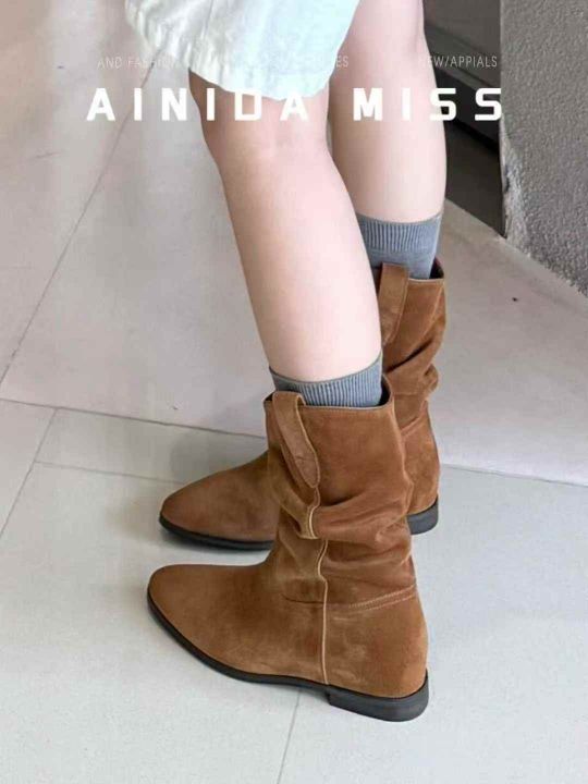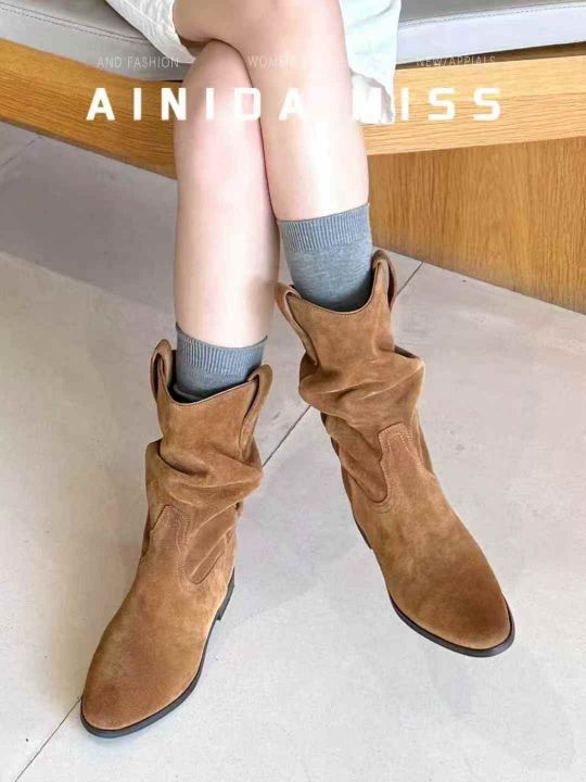 牛皮版~法式尖头西部牛仔靴女2025新款冬季短筒堆堆靴...