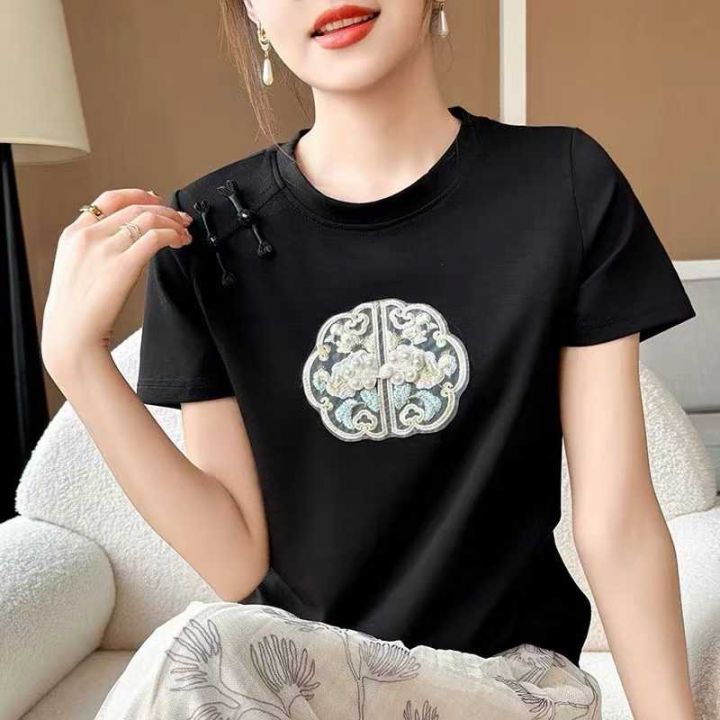 纯棉辣妹T国风刺绣别致盘扣正肩短袖t恤女新款夏季新中式独特气质上衣403件...