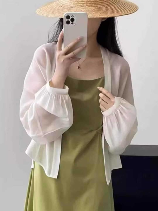 5.8元清复古雪纺开衫空调防晒衫,两个整款大同小异,雪纺料的是灯笼加长袖...