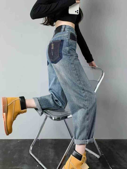 撞色口袋高腰阔腿显瘦牛仔裤女,图片款两个整款1300件,尺码xxs~3XL码,可...