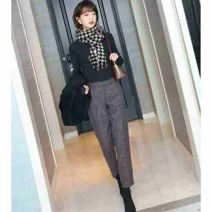 女裤2025秋冬棕咖色深灰色人字纹毛呢西裤女九分烟管裤...