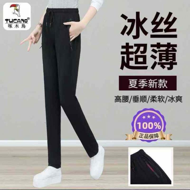 啄木鸟冰丝运动裤女夏季宽松长裤拉链口袋速干直筒裤高...