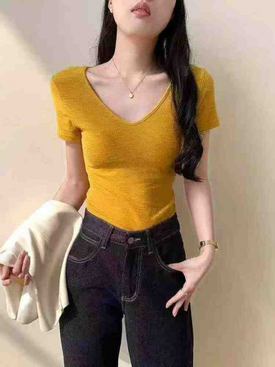 [月亮]:6.5清1240件[月亮]:韩系褶皱肌理感V领正肩T...