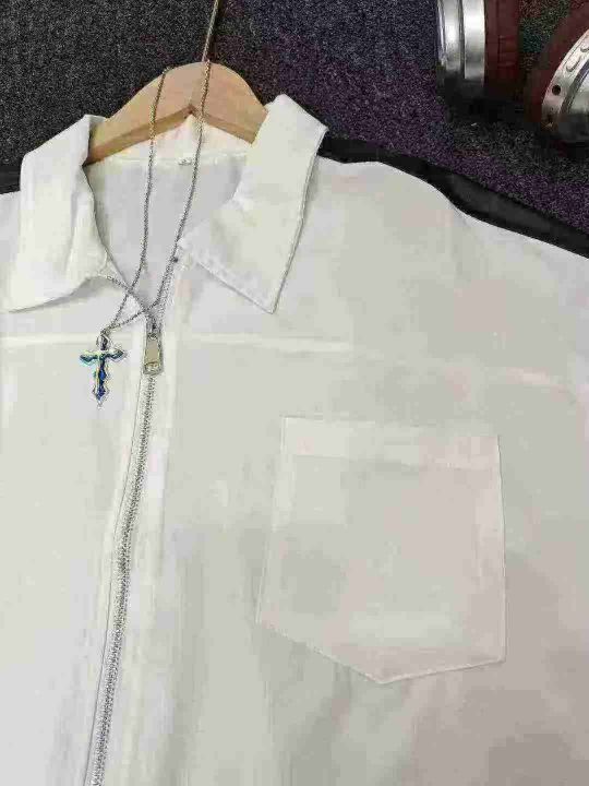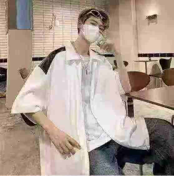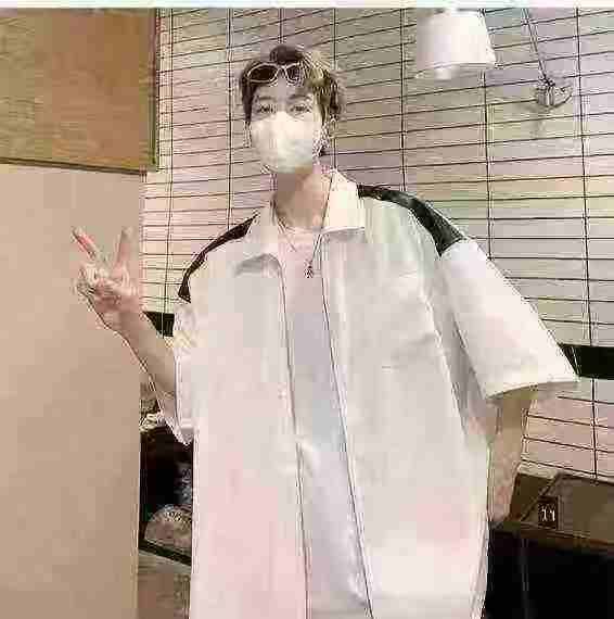衬衫男夏季小众设计感撞色短袖衬衣美式高街潮牌宽松休闲外套