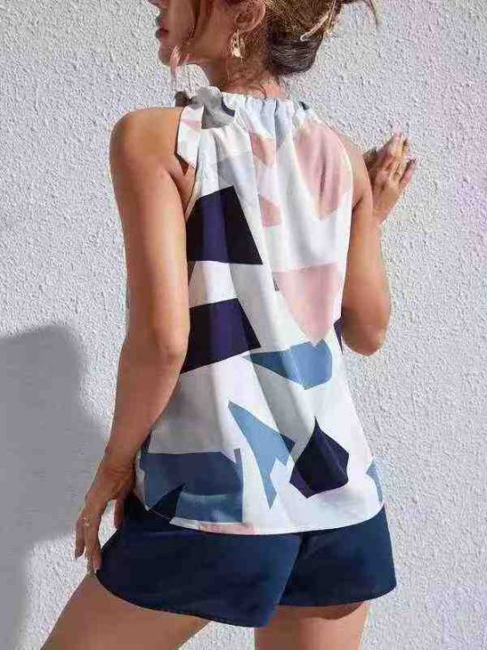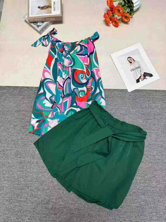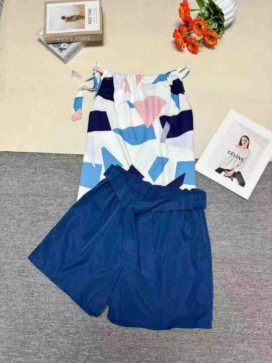 欧美外贸爆款几何印花系带无袖上衣束带短裤休闲套装 ...