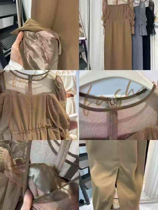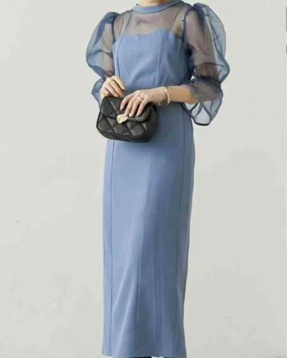 250条日单圆领拼接网纱微透喇叭袖收腰显瘦纯色开衩鱼尾连衣裙,质量超好!琉璃网纱微弹力不易勾丝,有内衬,尺码S-L,独立包装!全清17.8。 货号:1303