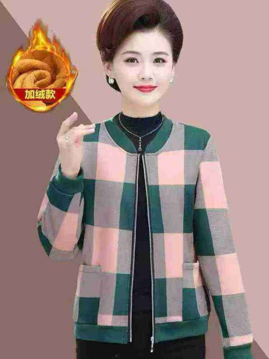 妈妈装圆领拉链夹克开衫春秋款,百搭格子款外套,加绒...